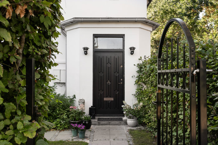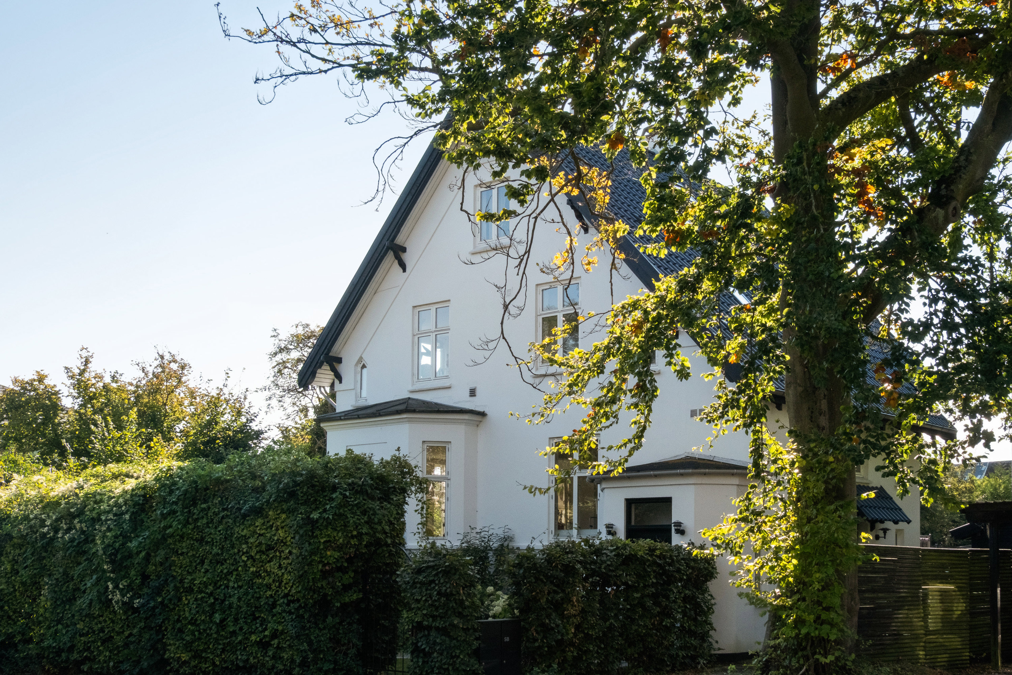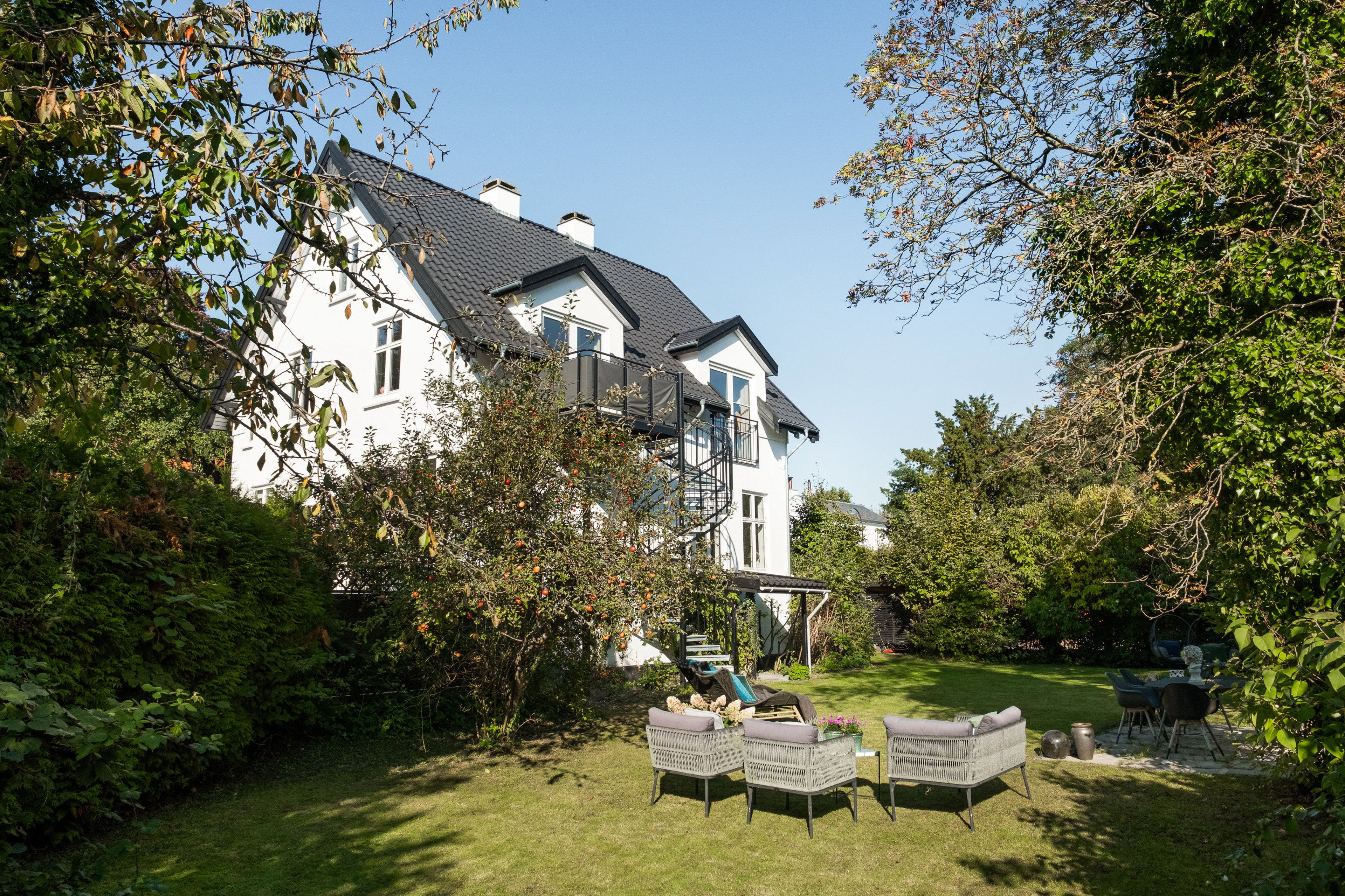 Villaen fra 1907 har sort tegltag, hvide facader og sprossede vinduer – tidløs arkitektur med harmonisk udtryk. Fra altanen fører trappen ned til den private, solrige have med hyggelige kroge.