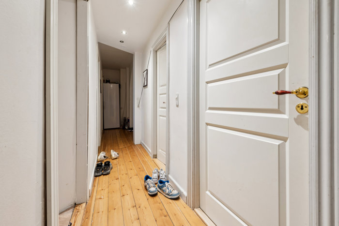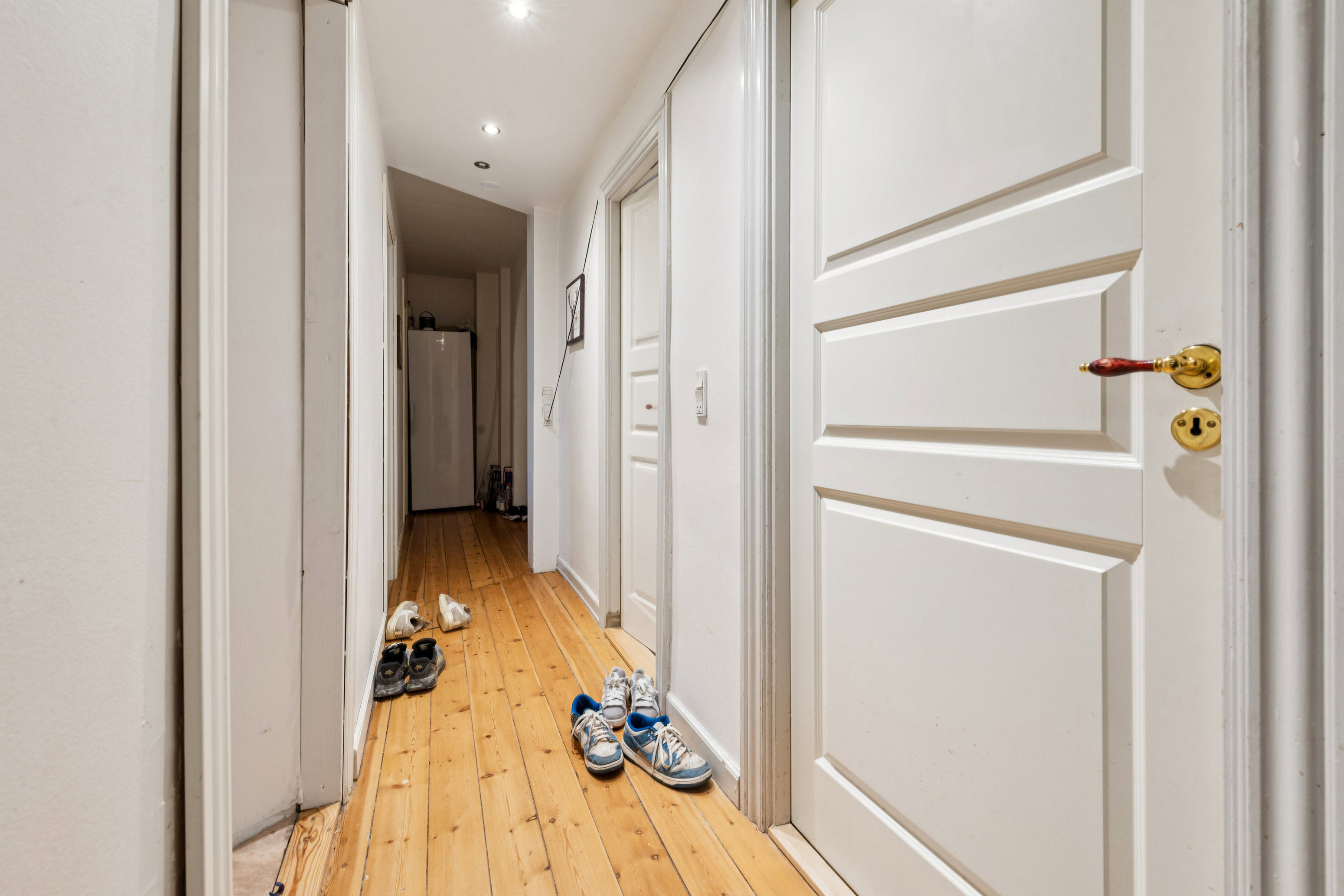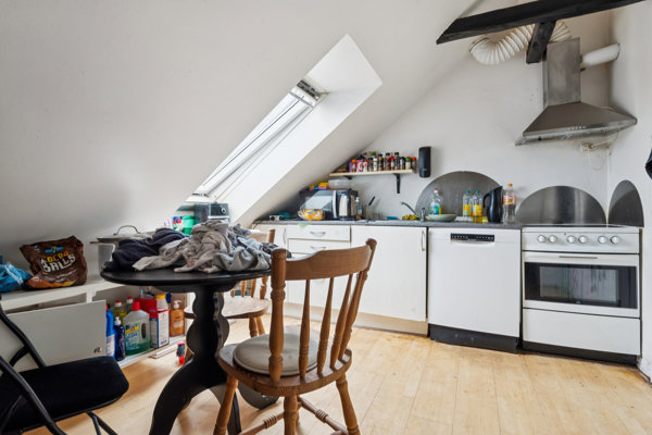 Villalejligheden byder på en række værelser placeret omkring en central fordelingsgang, hvilket giver mange anvendelsesmuligheder alt fra børneværelser til hobbyrum eller hjemmearbejdspladser. Der er også et gæstetoilet og adgang til trappeopgangen. Tagetagen rummer mere klassiske opholdsrum med køkken, bad og ekstra værelser. Køkkenet på tageetagen fremstår som et naturligt samlingspunkt, og der er både et mindre og et større badeværelse. Igen giver de mange værelser en fleksibilitet, der sjældent ses i bynære villalejligheder. Planløsningen er funktionel, og rummene har gode proportioner, hvilket gør indretningen nem at arbejde med, uanset om man ønsker åbne opholdsmiljøer eller en mere traditionel opdeling.