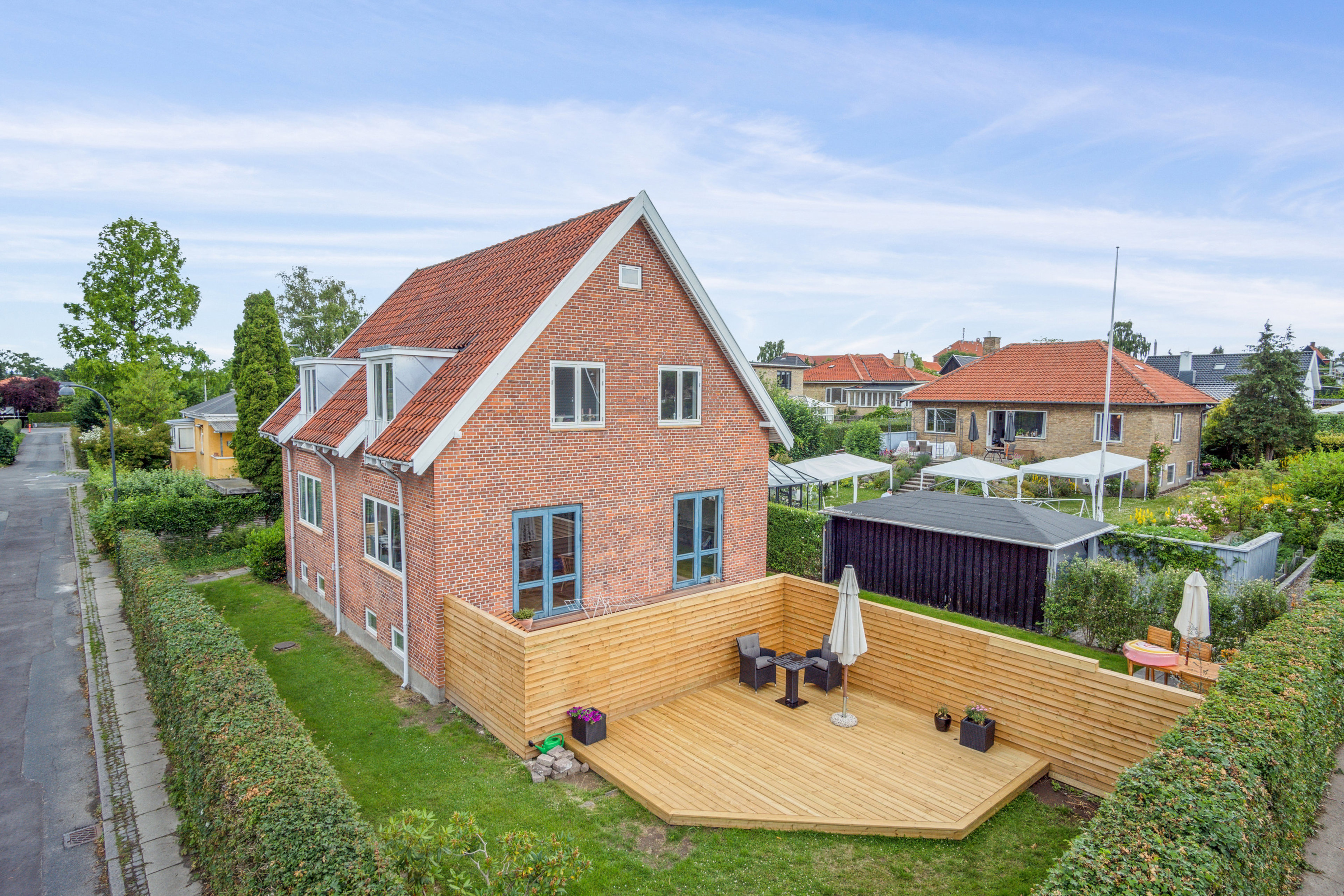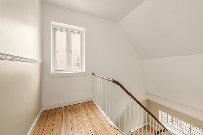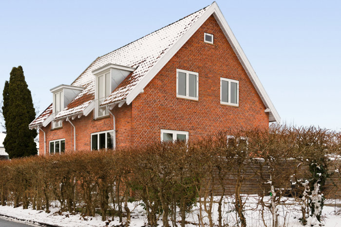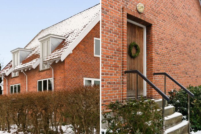 rødt tegltag, røde mursten og store vinduer. Her overtager I en veldisponeret villalejlighed.