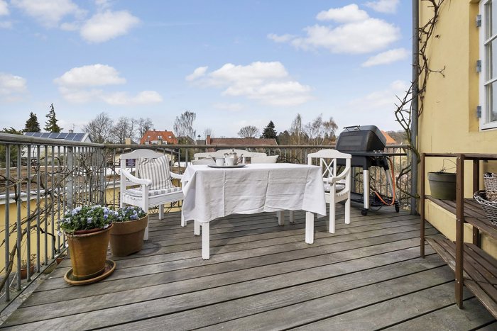 Via en smuk svungen trappe bevæger du dig op til værelsesetagen, hvor der er mulighed for op til tre gode soveværelser. Her er et yderligere badeværelse – også med brus – og masser af lysindfald fra franske altaner samt en skøn udsigt over kvarteret. Hele boligen har smukke plankegulve og en varm atmosfære.