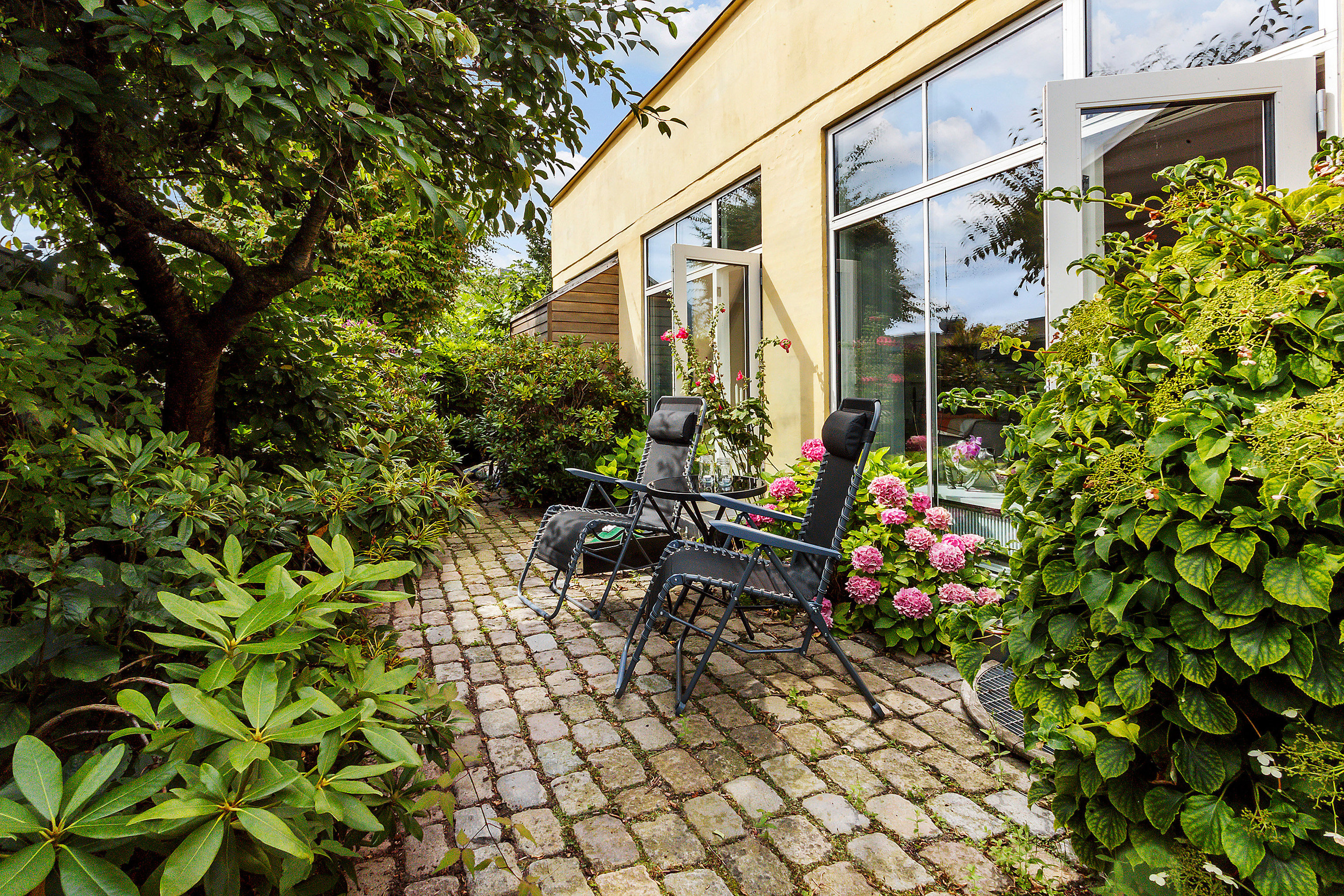 Husets indgang går via Damtofte Sønderstræde, et lille idyllisk stræde hvor ro og naboskab hersker.