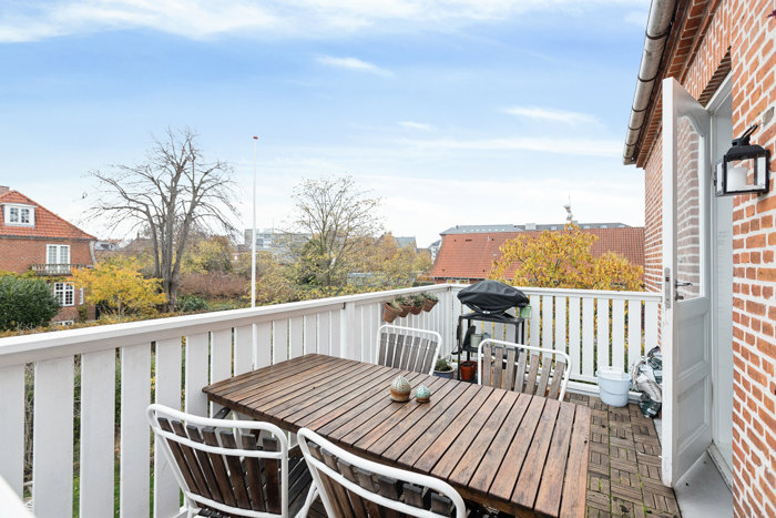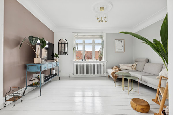 Hvide farver og luftige rumfornemmelser hersker på den anden side af hoveddøren, der åbner op til 147 kvadratmeter bolig. Plankegulve, fyldningsdøre, stukkatur og dannebrogsvinduer i flere fag vidner om ejendommens klassiske ophav, mens den flotte stand samt det moderne inventar i såvel køkkenet som på badeværelset skruer op for komforten.