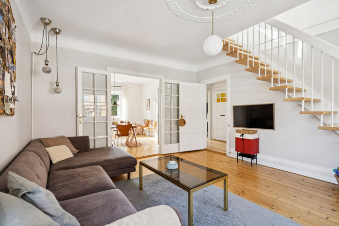 Hjemmet byder på smukke, tidløse elementer som fyldningsdøre, elegante franske døre mellem to stuer en suite, klassiske gulve og flot stukkatur, der tilfører hjemmet stemning og en herskabelig karakter. Et nydeligt køkken blender naturligt ind i indretningen, og planløsningen består ligeledes af et badeværelse med separat brus samt et stort soveværelse med skabsplads i boligens nedre plan. Øverst i lejligheden, og i ejendommen, er der et kæmpe værelse/alrum, som kan indrettes til mange formål.