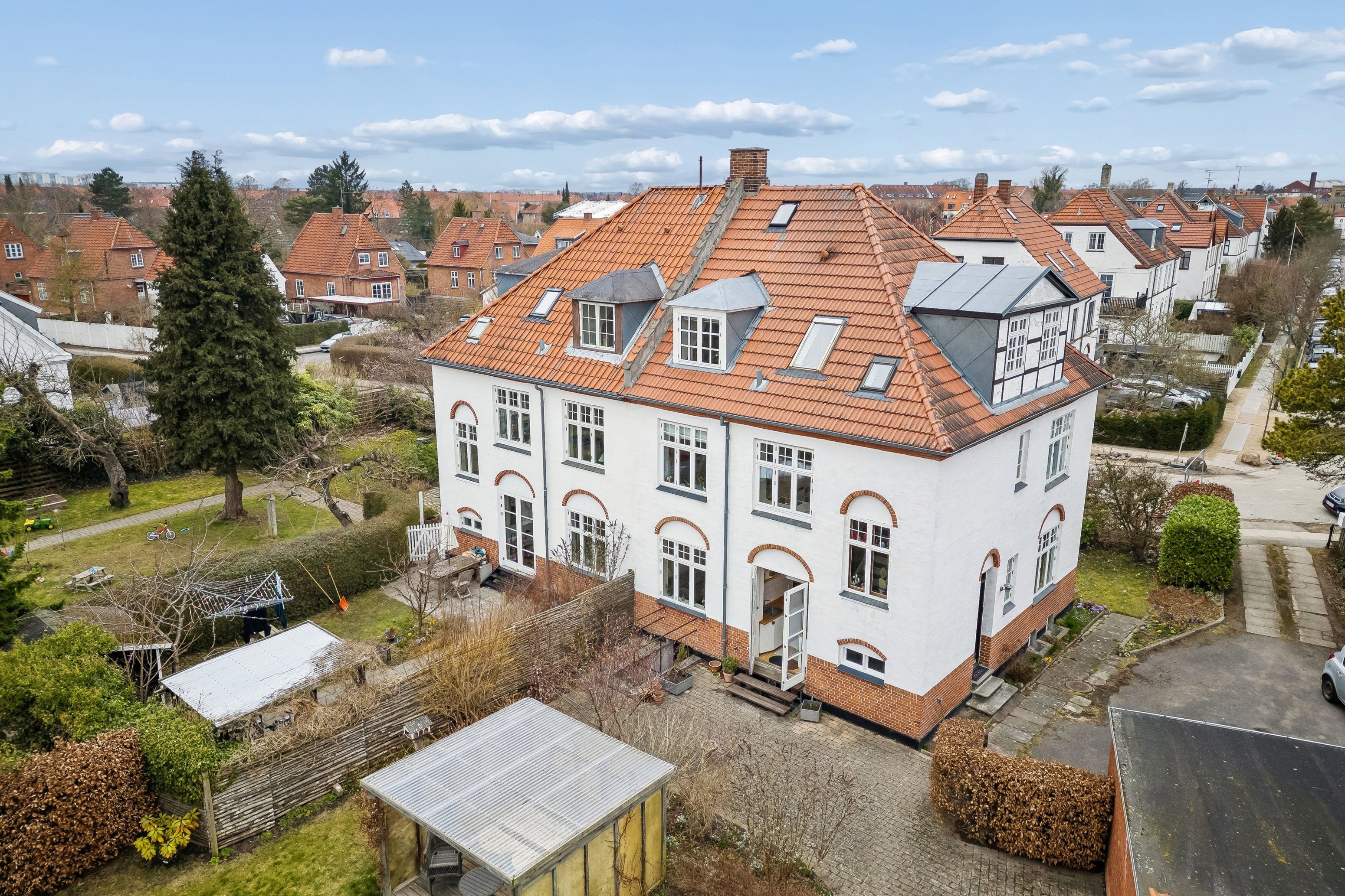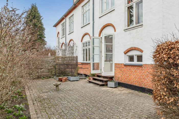 De fine detaljer er mange, som I ankommer til det hvide hus, der står med karakteristiske røde tegl på taget og hvælvede stik over vinduerne. I skal overtage lejligheden i stueetagen, og det betyder som nævnt, at der er direkte udgang til jeres egen have, som endda ligger solrigt mod syd. Der er terrasse, græsplæne og privatliv, og I får tilmed brugsret til en stor og anvendelig garage. Der er endda fællesrum i kælderen.