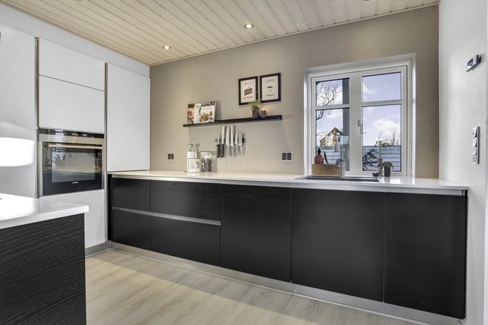 Køkken/alrummet er elegant indrettet med stilrent inventar i sort/hvid kontrast, integrerede hvidevarer og god arbejdsplads. Køkkenøen samler rummet og giver et naturligt flow til spisepladsen, mens franske døre åbner op til den store stue.