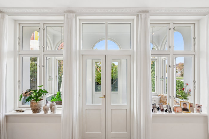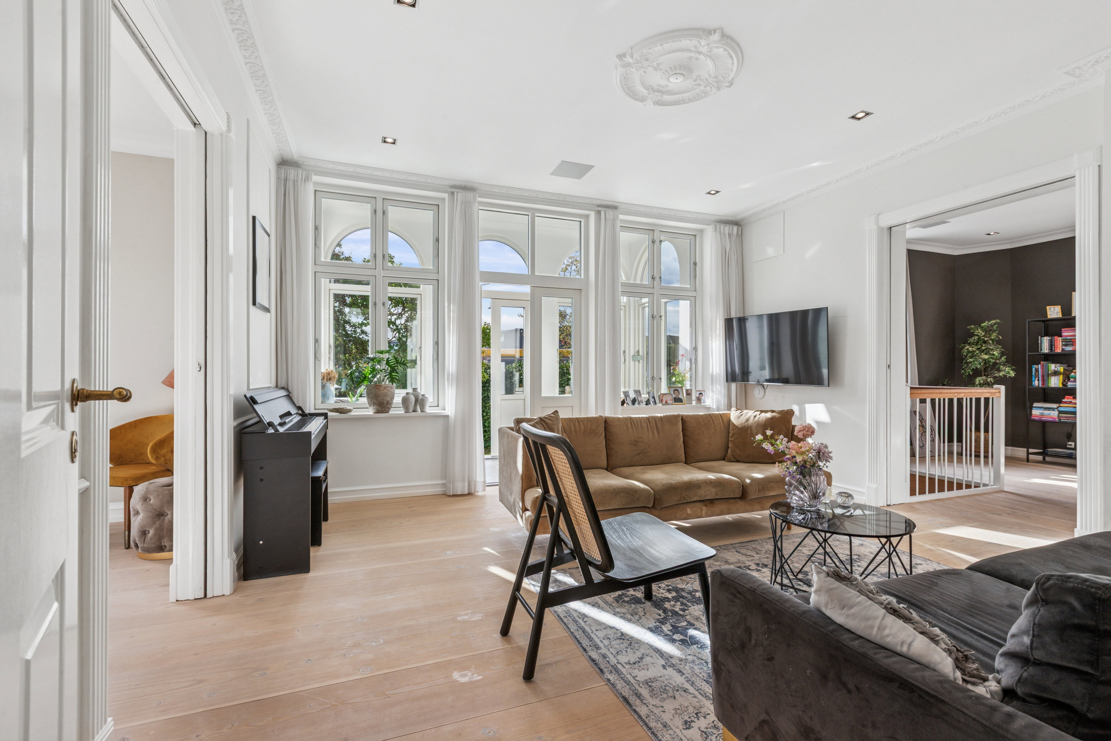 Denne vidunderlige villalejlighed på 154 m2 fremstår i dag som et kompromisløst hjem, hvor klassisk herskabelighed møder moderne komfort og æstetik i særklasse. Her venter høje stuklofter med rosetter og klassiske gerigter, der står som elegante vidnesbyrd om husets alder, sat i scene af en nænsom totalmodernisering med sans for kvalitet og atmosfære. Smukke Dinesen plankegulve, tre lags lydglas i vinduer og døre, indbyggede GUBI-lamper og fuld, app-styret gulvvarme på samtlige etagemeter skaber en gennemført følelse af eksklusiv komfort.