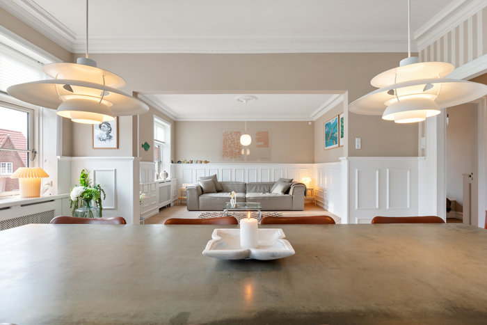 Indenfor mødes I af lyse rum med en gennemført og indbydende atmosfære. På første etage folder boligens opholdsafdeling sig ud med en rummelig stue og en indbydende spisestue i åben forbindelse. Her er et flot lysindfald fra de mange vinduer, lyse plankegulve og fine klassiske detaljer som brystningspaneler, stuk og loftrosetter, der understreger boligens elegante udtryk. Det er rum, der både føles repræsentative og behagelige at opholde sig i til hverdag.